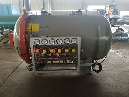 在工作的過程中罐內會有抽真空的步驟,一般來講該設備都是多路抽真空的,罐外可以看到有著一排的真空表進行每一個管路進行抽真空,我們?yōu)榱俗寜毫_到我們想要的結果還要對罐內進行加壓,壓力作用于制品上這樣就能更快的滲透和固化使得整個熱壓固化過程加速,一般來說現在的熱壓罐都是高壓熱壓罐。